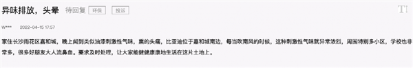 有一位业主留言称,“我是雨花区中建嘉和城业主,入住两年了,期间经常闻到刺激性气味,有很浓的油漆施工味道,深感不适。” 还有人表示,“家住长沙雨花区嘉和城,晚上闻到类似油漆刺激性气味,熏的头痛,比亚迪位于嘉和城南边,每当吹南风的时候,这种刺激性气味就异常浓烈,周围特别多小区,学校也非常多,很多好朋友大人流鼻血。要求及时处理,让大家能健健康康地生活在这片土地上。”