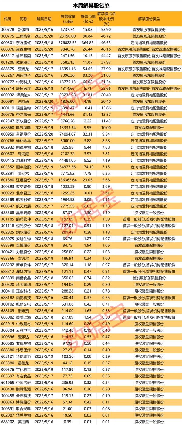 业绩方面,去年一季度顺丰大幅亏损9.89亿元;今年一季度顺丰扭亏为盈,实现净利润10.22亿元。但经营状况向好却未能止住股价持续下跌。今年以来,公司股价累计下跌27.74%。截至一季度末,顺丰控股股东户数为22.02万户。 28股解禁压力较小 解禁市值均不足亿元 数据宝统计,有友食品、华培动力、华兰生物、联合光电、美迪西等5股解禁市值低于一千万元,类型均为股权激励限售/一般股份。 相较于解禁市值,解禁比例(解禁股数量占总股本比例)更能解释解禁对于股价的冲击。数据宝统计,12股解禁比例超过20%。 其中,新城市解禁比例居首,高达53.9%;三角防务、东方盛虹、诺泰生物、睿昂基因等4股解禁比例在45%左右。 解禁股5月集体上涨 9股一季度业绩翻倍 5月至今,上证指数收涨1.22%,期间解禁股集体大涨。数据宝统计,61股平均涨幅达到6.2%,仅3股累计小幅下跌。10股涨逾10%,鹏辉能源、新城市涨幅居前,依次为32.06%、22.33%。 机构关注度方面,顺丰控股、博腾股份、诺唯赞评级机构家数在20家以上。其后盛美上海、金博股份、鸿远电子、北京君正、东方盛虹获15家以上机构评级。 9股一季度业绩翻倍。其中,安旭生物、亚辉龙分别实现净利润30倍以上、10倍以上高增长,两家均为新冠概念上市公司。 安旭生物表示,新冠产品市场销售规模增大致使公司净利润快速增长。 亚辉龙称,业绩高增长主要系公司新冠抗原检测试剂盒(胶体金法)海外销售大幅增长所致。 此外,星期六一季度净利润增长824%;博腾股份和明德生物净利润增幅双双超过300%。