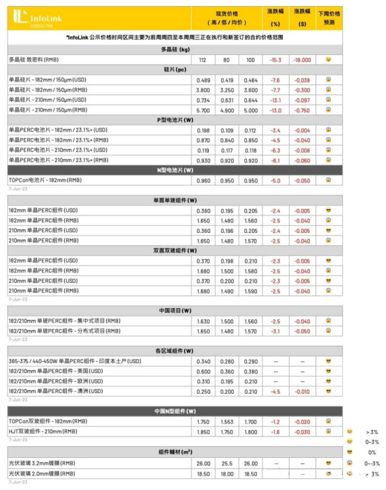 本周组件价格持续明显下降,均价暂时下滑至单玻每瓦1.6-1.63元人民币、双玻主流价格1.62-1.65元。其中观察厂家价格,价格策略分化极大,价差仍在持续拉大,混乱局势恐将持续延续至7月。本月旧单仍有占据约5-6成以上的份额,然而情况至7月来看新签单占比持续提升,价格在后续仍有较大幅度的调整。其中一线厂家价格仍希望挺住价格每瓦1.54-1.58元左右的水平,其中前期项目签单仍有约1.6元以上的水平在执行,新签订单价格约1.5-1.55元人民币不等,低价区段也有部分厂家下降价格出清库存,本周开始有听到跌破1.5元的价格出现。而中后段厂家观察,总体平均价格分化极大,部分厂家也想跟随一线维持价格,然而低价也已有1.45元的现货报价,总体平均价格约在1.5-1.55元人民币不等。