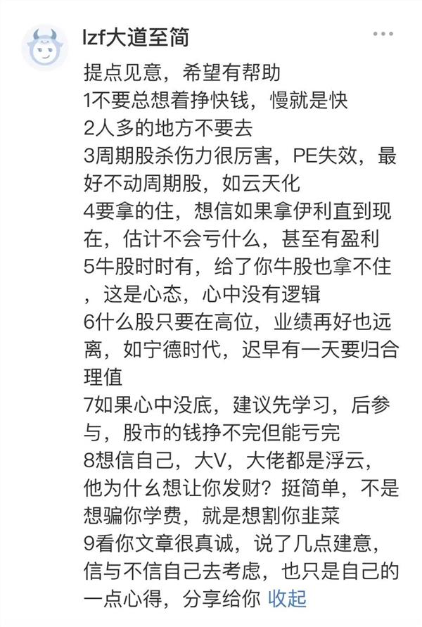 比如有网友说:兄弟,你现在话语间已经透露了很大的赌性,起初买伊利为了价投,亏损太大就会想着迅速回本,一个股票既然能涨百分之二百,为什么不能腰斩跌百分之50呢?