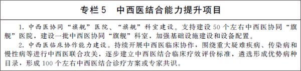 4.提高中西医结合水平。 推动综合医院中西医协同发展。在综合医院推广“有机制、有团队、有措施、有成效”的中西医结合医疗模式,将中医纳入多学科会诊体系,加强中西医协作和协同攻关,制定实施“宜中则中、宜西则西”的中西医结合诊疗方案。将中西医协同发展工作纳入医院评审和公立医院绩效考核。推动三级综合医院全部设置中医临床科室,设立中医门诊和中医病床。打造一批中西医协同“旗舰”医院、“旗舰”科室,开展重大疑难疾病、传染病、慢性病等中西医联合攻关。 加强中西医结合医院服务能力建设。建立符合中西医结合医院特点和规律的绩效评价指标体系,修订中西医结合医院工作指南。加强中西医结合医院业务用房等基础设施建设,强化设备配置。开展中西医结合学科和专科建设,促进中西医联合诊疗模式改革创新。 提升相关医疗机构中医药服务水平。引导专科医院、传染病医院、妇幼保健机构规范建设中医临床科室、中药房,普遍开展中医药服务,创新中医药服务模式,加强相关领域中医优势专科建设。优化妇幼中医药服务网络,提升妇女儿童中医药预防保健和疾病诊疗服务能力。