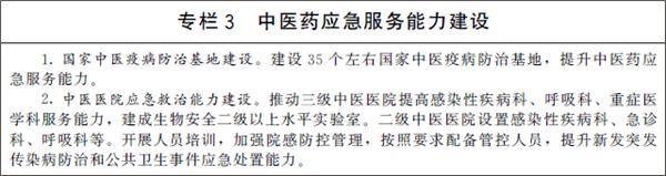 2.提升中医药参与新发突发传染病防治和公共卫生事件应急处置能力。 完善中医药参与应急管理的制度。在传染病防治法、突发公共卫生事件应对法等法律法规制修订中,研究纳入坚持中西医并重以及中西医结合、中西药并用、加强中医救治能力建设等相关内容,推动建立有效机制,促进中医药在新发突发传染病防治和公共卫生事件应急处置中发挥更大作用。 加强中医药应急救治能力建设。依托高水平三级甲等中医医院,建设覆盖所有省份的国家中医疫病防治基地,依托基地组建中医疫病防治队伍,提升中医紧急医学救援能力。三级公立中医医院和中西医结合医院(不含中医专科医院)全部设置发热门诊,加强感染性疾病、急诊、重症、呼吸、检验等相关科室建设,提升服务能力。 强化中医药应急救治支撑保障。加强中医药应急科研平台建设,合理布局生物安全三级水平实验室。加大国家中医药应对重大公共卫生事件和疫病防治骨干人才培养力度,形成人员充足、结构合理、动态调整的人才库,提高中医药公共卫生应急和重症救治能力。完善中药应急物资保障供应机制。