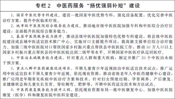 三、主要任务 (一)建设优质高效中医药服务体系。 1.做强龙头中医医院。依托综合实力强、管理水平高的中医医院,建设一批国家中医医学中心,在疑难危重症诊断与治疗、高层次中医药人才培养、高水平研究与创新转化、解决重大公共卫生问题、现代医院管理、传统医学国际交流等方面代表全国一流水平。将全国高水平中医医院作为输出医院,推进国家区域医疗中心建设项目,在优质中医药资源短缺或患者转外就医多的省份设置分中心、分支机构,促进优质中医医疗资源扩容和均衡布局。 2.做优骨干中医医院。加强各级各类中医医院建设,强化以中医药服务为主的办院模式和服务功能,规范科室设置,推进执行建设标准,补齐资源配置不平衡的短板,优化就医环境,持续改善基础设施条件。建设一批中医特色重点医院。提升地市级中医医院综合服务能力。支持中医医院牵头组建医疗联合体。 3.做实基层中医药服务网络。实施基层中医药服务能力提升工程“十四五”行动计划,全面提升基层中医药在治未病、疾病治疗、康复、公共卫生、健康宣教等领域的服务能力。持续加强县办中医医疗机构建设,基本实现县办中医医疗机构全覆盖。加强基层医疗卫生机构中医药科室建设,力争实现全部社区卫生服务中心和乡镇卫生院设置中医馆、配备中医医师,100%的社区卫生服务站和80%以上的村卫生室能够提供中医药服务。实施名医堂工程,打造一批名医团队运营的精品中医机构。鼓励有资质的中医专业技术人员特别是名老中医开办中医诊所。鼓励有条件的中医诊所组建家庭医生团队开展签约服务。推动中医门诊部和诊所提升管理水平。 4.健全其他医疗机构中医药科室。强化综合医院、专科医院和妇幼保健机构中医临床科室、中药房建设,有条件的二级以上公立综合医院设立中医病区和中医综合治疗区。鼓励社会办医疗机构设置中医药科室。 (二)提升中医药健康服务能力。 1.彰显中医药在健康服务中的特色优势。 提升疾病预防能力。实施中医药健康促进行动,推进中医治未病健康工程升级。开展儿童青少年近视、脊柱侧弯、肥胖等中医适宜技术防治。规范二级以上中医医院治未病科室建设。在各级妇幼保健机构推广中医治未病理念和方法。继续实施癌症中西医结合防治行动,加快构建癌症中医药防治网络。推广一批中医治未病干预方案,制定中西医结合的基层糖尿病、高血压防治指南。在国家基本公共卫生服务项目中优化中医药健康管理服务,鼓励家庭医生提供中医治未病签约服务。持续开展0—36个月儿童、65岁以上老年人等重点人群的中医药健康管理,逐步提高覆盖率。 增强疾病治疗能力。开展国家中医优势专科建设,以满足重大疑难疾病防治临床需求为导向,做优做强骨伤、肛肠、儿科、皮肤科、妇科、针灸、推拿及脾胃病、心脑血管病、肾病、肿瘤、周围血管病等中医优势专科专病,巩固扩大优势,带动特色发展。制定完善并推广实施一批中医优势病种诊疗方案和临床路径,逐步提高重大疑难疾病诊疗能力和疗效水平。加强中药药事管理,落实处方专项点评制度,促进合理使用中药。鼓励依托现有资源建设中医医疗技术中心,挖掘整理并推广应用安全有效的中医医疗技术。大力发展中医非药物疗法,充分发挥其在常见病、多发病和慢性病防治中的独特作用。加强护理人员中医药知识与技能培训,开展中医护理门诊试点。 强化特色康复能力。实施中医药康复服务能力提升工程。依托现有资源布局一批中医康复中心,二级以上中医医院加强康复(医学)科建设,康复医院全部设置传统康复治疗室,其他提供康复服务的医疗机构普遍能够提供中医药服务。探索有利于发挥中医药优势的康复服务模式。促进中医药、中华传统体育与现代康复技术融合,发展中国特色康复医学。针对心脑血管病、糖尿病、尘肺病等慢性病和伤残等,制定推广中医康复方案,推动研发中医康复器具。大力开展培训,推动中医康复技术进社区、进家庭、进机构。