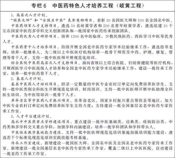 5.优化中医医疗服务模式。完善以病人为中心的服务功能,优化服务流程和方式,总结推广中医综合诊疗模式、多专业一体化诊疗模式和集预防、治疗、康复于一体的全链条服务模式。推进智慧医疗、智慧服务、智慧管理“三位一体”的智慧中医医院建设。建设中医互联网医院,发展远程医疗和互联网诊疗。持续推进“互联网+医疗健康”、“五个一”服务行动。构建覆盖诊前、诊中、诊后的线上线下一体化中医医疗服务模式,让患者享有更加便捷、高效的中医药服务。 (三)建设高素质中医药人才队伍。 1.深化中医药院校教育改革。深化医教协同,进一步推动中医药教育改革与高质量发展。建立以中医药课程为主线、先中后西的中医药类专业课程体系,优化专业设置、课程设置和教材组织,增设中医疫病课程,增加经典课程内容,开展中医药经典能力等级考试。强化中医思维培养,建立早跟师、早临床学习制度,将师承教育贯穿临床实践教学全过程。加大对省(部)局共建中医药院校改革发展的支持力度,推动建设100个左右中医药类一流本科专业建设点。加强中医临床教学能力建设,提升高校附属医院和中医医师规范化培训基地教学能力。实施卓越中医药师资培训计划。依托现有资源,支持建设一批中医药高水平高等职业学校和专业(群)。 2.强化中医药特色人才队伍建设。实施中医药特色人才培养工程(岐黄工程)。打造岐黄学者品牌,持续开展岐黄学者培养、全国中医临床优秀人才研修等项目,做强领军人才、优秀人才、骨干人才梯次衔接的高层次人才队伍。建设一批高水平中医药重点学科。构建符合中医药特点的人才培养模式,发展中医药师承教育,建立高年资中医医师带徒制度,与职称评审、评优评先等挂钩,持续推进全国名老中医药专家传承工作室、全国基层名老中医药专家传承工作室建设。将综合医院、妇幼保健院等医疗机构中医药人才纳入各类中医药人才培养项目。按照“下得去、留得住、用得上”的要求,加强基层中医药人才队伍建设,根据需求合理确定中医专业农村订单定向免费培养医学生规模,在全科医生特岗计划中积极招收中医医师。推广中医药人员“县管乡用”,探索推进轮岗制与职称评审相衔接。适当放宽长期服务基层的中医医师职称晋升条件,表彰奖励评优向基层一线和艰苦地区倾斜,引导中医药人才向基层流动。 3.完善落实西医学习中医制度。开展九年制中西医结合教育试点。增加临床医学类专业中医药课程学时,将中医药课程列为本科临床医学类专业必修课和毕业实习内容,在临床类别医师资格考试中增加中医知识。落实允许攻读中医专业学位的临床医学类专业学生参加中西医结合医师资格考试和中医医师规范化培训的政策要求。在高职临床医学类专业中开设中医基础与适宜技术必修课程。临床、口腔、公共卫生类别医师接受必要的中医药继续教育,综合医院对临床医师开展中医药专业知识轮训,使其具备本科室专业领域的常规中医诊疗能力。加强中西医结合学科建设,培育一批中西医结合多学科交叉创新团队。实施西医学习中医人才专项,培养一批中西医结合人才。