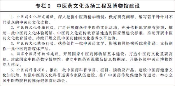 (六)发展中医药健康服务业。 1.促进和规范中医药养生保健服务发展。促进中医健康状态辨识与评估、咨询指导、健康干预、健康管理等服务规范开展。推广太极拳、八段锦等中医药养生保健方法和中华传统体育项目,推动形成体医结合的健康服务模式。鼓励中医医疗机构为中医养生保健机构提供技术支持,支持中医医师依照规定提供服务。 2.发展中医药老年健康服务。强化中医药与养老服务衔接,推进中医药老年健康服务向农村、社区、家庭下沉。逐步在二级以上中医医院设置老年病科,增加老年病床数量,开展老年病、慢性病防治和康复护理。推动二级以上中医医院与养老机构合作共建,鼓励有条件的中医医院开展社区和居家中医药老年健康服务。鼓励中医医师加入老年医学科工作团队和家庭医生签约团队,鼓励中医医师在养老机构提供保健咨询和调理服务。推动养老机构开展中医特色老年健康管理服务。在全国医养结合示范项目中培育一批具有中医药特色的医养结合示范机构,在医养结合机构推广中医药适宜技术。 3.拓展中医药健康旅游市场。鼓励地方结合本地区中医药资源特色,开发更多体验性强、参与度高的中医药健康旅游线路和旅游产品,吸引境内外消费者。完善中医药健康旅游相关标准体系,推动中医药健康旅游高质量发展。 4.丰富中医药健康产品供给。以保健食品、特殊医学用途配方食品、功能性化妆品、日化产品为重点,研发中医药健康产品。鼓励围绕中医养生保健、诊疗与康复,研制便于操作、适于家庭的健康检测、监测产品及自我保健、功能康复等器械。 (七)推动中医药文化繁荣发展。 1.加强中医药文化研究和传播。深入挖掘中医药精华精髓,阐释中医药文化与中华优秀传统文化的内在联系。加强中医药学与相关领域协同创新研究。实施中医药文化传播行动,推动建设体验场馆,培育传播平台,丰富中医药文化产品和服务供给。推动中医药文化贯穿国民教育始终,进一步丰富中医药文化教育。加强中医药机构文化建设。加大对传统医药类非物质文化遗产代表性项目的保护传承力度。加强中医药科普专家队伍建设,推动中医医疗机构开展健康讲座等科普活动。建设中医药健康文化知识角。开展公民中医药健康文化素养水平监测。 2.发展中医药博物馆事业。开展国家中医药博物馆基本建设,建成国家中医药数字博物馆。促进中医药博物馆体系建设,强化各级各类中医药博物馆收藏研究、社会教育、展览策划和文化服务功能,加强数字化建设,组织内容丰富的中医药专题展览。 3.做大中医药文化产业。鼓励引导社会力量通过各种方式发展中医药文化产业。实施中医药文化精品行动,引导创作一批质量高、社会影响力大的中医药文化精品和创意产品。促进中医药与动漫游戏、旅游餐饮、体育演艺等融合发展。培育一批知名品牌和企业。