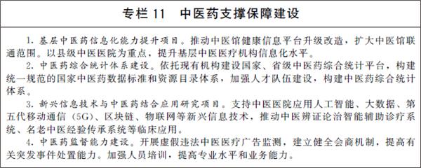 (九)深化中医药领域改革。 1.建立符合中医药特点的评价体系。建立完善科学合理的中医医疗机构、特色人才、临床疗效、科研成果等评价体系。健全公立中医医院绩效考核机制,常态化开展三级和二级公立中医医院绩效考核工作。完善各类中医临床教学基地标准和准入制度。建立完善符合中医药特点的人才评价体系,强化中医思维与临床能力考核,将会看病、看好病作为中医医师的主要评价内容。研究建立中医药人才表彰奖励制度。研究优化中医临床疗效评价体系,探索制定符合中医药规律的评价指标。通过同行评议、引进第三方评估等方式,完善有利于中医药创新的科研评价机制。 2.健全现代医院管理制度。建立体现中医医院特点的现代医院管理制度,落实党委领导下的院长负责制,推动公立中医医院发展方式从规模扩张转向提质增效和中医内涵式特色发展,运行模式从粗放管理转向精细化管理,资源配置从注重物质要素转向更加注重人才技术要素。推进公立中医医院人事管理制度和薪酬分配制度改革,落实“两个允许”要求。落实公立中医医院总会计师制度。建立完善中医医疗质量管理与控制体系,推进中医病案质量控制中心和中药药事管理质控中心建设。完善中医医院院感防控体系。构建和谐医患关系,改善中医医务人员工作环境和条件,在全社会营造尊重中医的良好氛围。 3.完善中医药价格和医保政策。建立以临床价值和技术劳务价值为主要依据、体现中医药特点的中医医疗服务卫生技术评估体系,优化中医医疗服务价格政策。在医疗服务价格动态调整中重点考虑中医医疗服务项目。医疗机构炮制使用的中药饮片、中药制剂实行自主定价,符合条件的按程序纳入基本医疗保险支付范围。改善市场竞争环境,引导形成以质量为导向的中药饮片市场价格机制。将符合条件的中医医疗服务项目和中药按程序纳入基本医疗保险支付范围。探索符合中医药特点的医保支付方式,遴选和发布中医优势病种,鼓励实行中西医同病同效同价。一般中医诊疗项目可继续按项目付费。继续深化中医药参与按床日付费、按人头付费等研究。支持保险公司、中医药机构合作开展健康管理服务,鼓励商业保险机构开发中医治未病等保险产品。 4.改革完善中药注册管理。优化中药临床证据体系,建立中医药理论、人用经验和临床试验“三结合”的中药注册审评证据体系,积极探索建立中药真实世界研究证据体系。探索中药饮片备案、审批管理,优化医疗机构中药制剂注册管理。推进古代经典名方目录制定发布,加快收载方剂的关键信息考证。 5.推进中医药领域综合改革。建设10个左右国家中医药综合改革示范区,鼓励在服务模式、产业发展、质量监管等方面先行先试,打造中医药事业和产业高质量发展高地。开展全国基层中医药工作示范市(县)创建工作。开展医疗、医保、医药联动促进中医药传承创新发展试点,发扬基层首创精神,完善更好发挥中医药特色优势的医改政策。 (十)强化中医药发展支撑保障。 1.提升中医药信息化水平。依托现有资源持续推进国家和省级中医药数据中心建设。优化升级中医馆健康信息平台,扩大联通范围。落实医院信息化建设标准与规范要求,推进中医医院及中医馆健康信息平台规范接入全民健康信息平台。加强关键信息基础设施、数据应用服务的安全防护,增强自主可控技术应用。开展电子病历系统应用水平分级评价和医院信息互联互通标准化成熟度测评。鼓励中医辨证论治智能辅助诊疗系统等具有中医药特色的信息系统研发应用。 2.建立国家中医药综合统计制度。逐步完善统计直报体系,建立与卫生健康统计信息共享机制。加强综合统计人才队伍建设,构建统一规范的国家中医药数据标准和资源目录体系,建设国家、省级中医药综合统计信息平台,建立统计数据定期发布机制,稳步推动数据资源共享开放。 3.加强中医药法治建设。深入推进中医药法贯彻实施,完善中医药法相关配套制度。推动制修订相关法律法规和规章,加强对地方性法规建设的指导。进一步推进全国人大常委会中医药法执法检查报告及审议意见落实工作。建立不良执业记录制度,将提供中医药健康服务的机构及其人员诚信经营和执业情况依法依规纳入全国信用信息共享平台。强化中医药监督执法工作,健全长效机制,落实执法责任,加强人员培训,完善监督执法规范,全面提高中医药监督能力和水平。 4.深化中医药军民融合发展。加强军地双方在中医药学科建设、科技创新、人才培养等方面的合作,完善工作机制和政策措施,畅通信息交流渠道,加快军事中医药学科全面建设与发展,提高军队中医药整体保障水平。