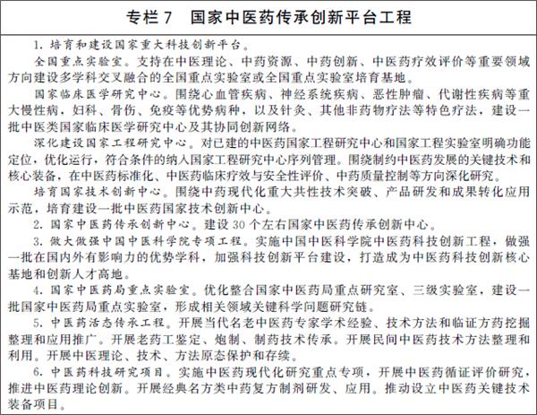 (四)建设高水平中医药传承保护与科技创新体系。 1.加强中医药传承保护。实施中医药古籍文献和特色技术传承专项,编纂出版《中华医藏》,建立国家中医药古籍和传统知识数字图书馆。加强对名老中医学术经验、老药工传统技艺等的活态传承,支持中医学术流派发展。推动出台中医药传统知识保护条例,建立中医药传统知识数据库、保护名录和保护制度。 2.加强重点领域攻关。在科技创新2030—重大项目、重点研发计划等国家科技计划中加大对中医药科技创新的支持力度。深化中医原创理论、中药作用机理等重大科学问题研究。开展中医药防治重大、难治、罕见疾病和新发突发传染病等诊疗规律与临床研究。加强中医药临床疗效评价研究。加强开展基于古代经典名方、名老中医经验方、有效成分或组分等的中药新药研发。支持儿童用中成药创新研发。推动设立中医药关键技术装备项目。 3.建设高层次科技平台。依托现有资源,建设一批国家级中医药研究平台,研究布局全国重点实验室、国家临床医学研究中心、国家工程研究中心和国家技术创新中心;推进国家中医药传承创新中心、国家中医临床研究基地和中国中医药循证医学中心建设。发挥中国中医科学院“国家队”作用,实施中医药科技创新工程。 4.促进科技成果转化。建设一批中医药科技成果孵化转化基地。支持中医医院与企业、科研机构、高等院校等加强协作、共享资源。鼓励高等院校、科研院所、医疗机构建立专业化技术转移机构,在成果转化收益分配、团队组建等方面赋予科研单位和科研人员更大自主权。