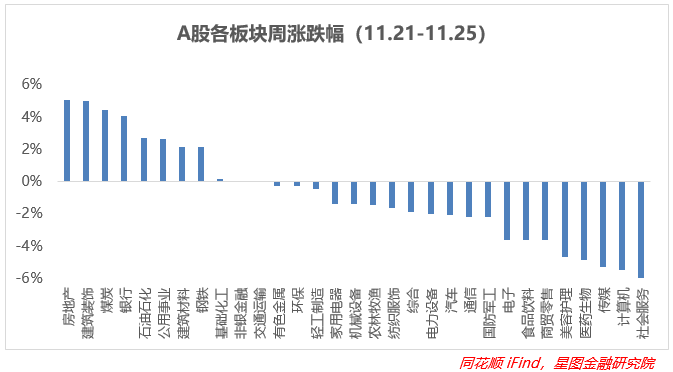 从板块来看,周内11个板块实现上涨,环比进一步减少6个板块,涨幅靠前的主要聚集在房地产、建筑装饰、煤炭、银行等行业,均涨超4%,周内针对地产行业利好频出,大金融板块表现超预期;涨幅改善的板块同样集中在上述价值、周期行业中,周环比均+3pct以上,医药生物、传媒、信创、部分消费在大涨之后开始回调,周环比均-5pct以上;地产在11月份已经实现了20%的涨幅,后续的反弹力度还需结合政策力度、居民部门消费意愿以及高频数据来支撑。