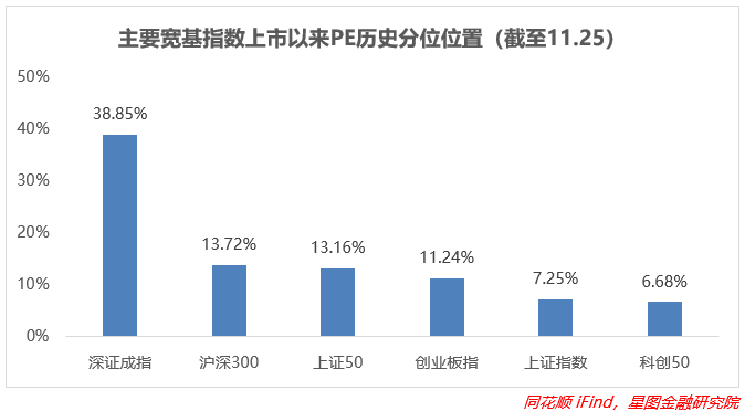 从上市以来分位值来看,上周几大指数估值都出现了下滑,尤其是代表科创成长的科创50和深证成指,环比下修幅度最大,分别-2.89pct、-2.09pct,创业板指紧随其后,环比-1.93pct;上证系指数周内表现较好,受市场资金追捧从而比较抗跌,环比下滑幅度最小;大部分主要指数依旧在底部区间震荡,深证成指分位数还在40%左右。