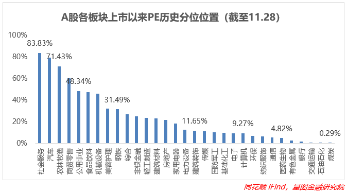从上市以来板块分位值来看,截至11月28日收盘,12个板块估值实现上修。地产政策的刺激使得相关产业链估值大幅上修,包括建筑装饰、房地产、钢铁、建筑材料,幅度都在1~8pct之间;金融板块同样受益,非银金融、银行分别+2.29pct、0.89pct;但是高端制造行业由于资金撤出,受挫比较严重,跌幅在2~6pct之间;大消费板块受到本周首个交易日的回暖,变动幅度不大。板块估值中位数为电力设备(12.82%)。