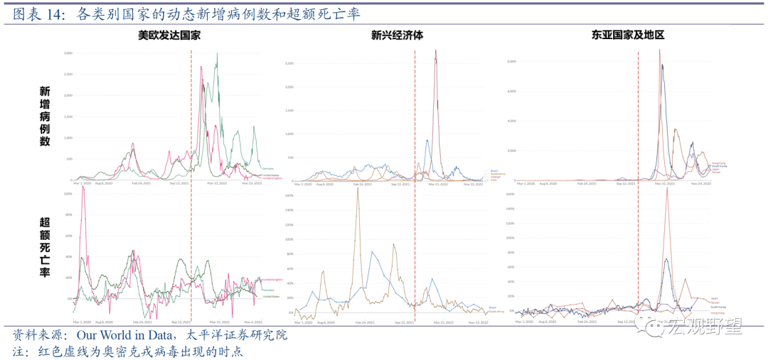 从疫情对于社会和人民健康的角度来看,我们认为疫情防控政策放开后中国将受到一轮很强的冲击,但社会秩序仍然可控。根据世界各国的经验,在奥密克戎病毒出现之后,几乎所有国家都出现了更大规模的疫情反弹,而且在此前防疫表现越好的国家在奥密克戎病毒出现之后感染率的峰值越高。比如东亚国家和地区,在奥密克戎病毒出现之前基本都能做到清零,但奥密克戎病毒出现并且疫情防控政策放开之后,每百万人的感染数目远远超过美欧发达国家和其它新兴经济体的感染峰值。也就是说,没有经历过群体免疫的国家,在疫情防控政策放开之后所受到的第一波冲击是会相当大的。中国在2022年11月份之后防疫政策快速放开后感染率的急速上升也验证了这一点。更值得关注的数据是死亡率。由于各国对于新冠病毒致死率的统计标准并不一致,所以我们选择了各国总人口的超额死亡率数据来进行比较。可以看出在奥密克戎病毒出现之后,虽然各国疫情都出现了更大规模的反弹,但是大多数国家的动态的超额死亡率反而是下降的,反映出奥密克戎病毒的致死率确实较此前的毒株更低。东亚国家和地区在奥密克戎病毒出现后的动态超额死亡率有明显提升,和其它国家的情况不同。不过我们认为这并非说明奥密克戎病毒对于东亚人种有特殊的影响,而是因为此前其它国家和地区已经经历过群体免疫,而东亚国家和地区一直处于清零状态,基本没有超额死亡,在奥密克戎变种出现并且各国防疫政策完全放开后,短期内病例数上升实在太快,导致超额死亡率也随之上升。不过从2020年疫情爆发以来的累计超额死亡率数据来看,东亚国家和地区仍然是最低的。全球大多数国家的累计超额死亡率在5%-25%之间,但东亚国家和地区的累计超额死亡率基本不超过10%。主要是因为此前毒性最强的原始毒株和德尔塔毒株基本没有冲击到东亚地区。我们预计中国防疫政策放开之后的累计超额死亡率可能在5%-10%之间,对应总人口死亡率可能从此前的7.18‰上升至7.54‰-7.9‰之间。这一代价较为沉重,但和其它国家的累计超额死亡率相比已经较低。而且从历史经验来看,中国这样幅度的死亡率提升不会对社会秩序的稳定产生明显影响。