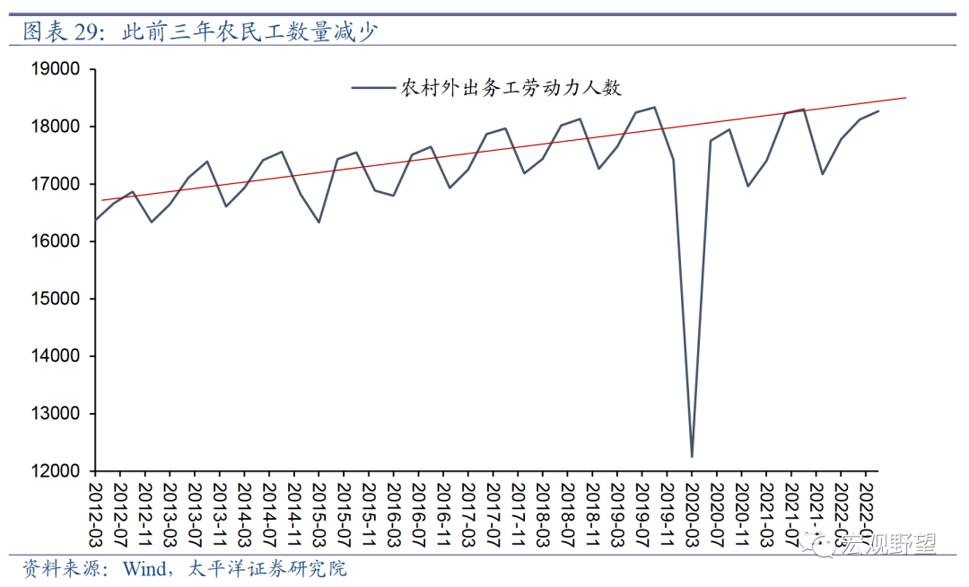 其次,从人口结构角度来看,我们认为中国也不易出现长期的劳动力供给不足。中国是典型的城乡二元结构,有大量的农民工群体在城市内工作,是城镇劳动力的重要来源。由于农民工群体的流动性较强,所以受到疫情的影响也会更大。那么广大农民工群体在春节返乡之后,是否会因为对疫情的恐惧而不再外出打工、造成劳动力供给的冲击呢?我们认为这可能会有短期的影响,但是不会长期化。上文中已经提到,从全球的经验来看,发展中国家疫情后人员流动恢复的状况更好。我们观察Google Mobility中“工作场所”的人数,可以明显发现人均GDP越低的国家,疫后恢复的程度越高。即穷人群体可能在疫后外出工作的意愿更强。全球各大洲均呈现这一规律,具有普适性。而中国也属于人均GDP并不高的国家,尤其广大农民工群体的收入水平相对较低,农民工家庭在此前三年疫情中受到的冲击也较大。所以,参照全球各国的经验,我们认为在疫情防控政策放开后,农民工群体外出工作、获取收入的迫切程度可能会强于其对于疫情的恐惧。即农民工不外出工作的情况预计不会长期存在。而且,此前三年中由于疫情防控政策的不确定性,外出务工人员减少很多,在未来疫情防控政策完全放开的背景下,可能会有更多农民工回归到城市的劳动力市场中来。