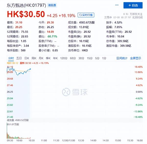 经历了周末“惊心动魄”的剧情,东方甄选早间开盘走高,逆势大涨超11%。开盘后,东方甄选股价一度最高达到31.1港元/股,涨幅超18%。截至发稿,东方甄选仍保持较高涨幅,总市值超300亿港元。