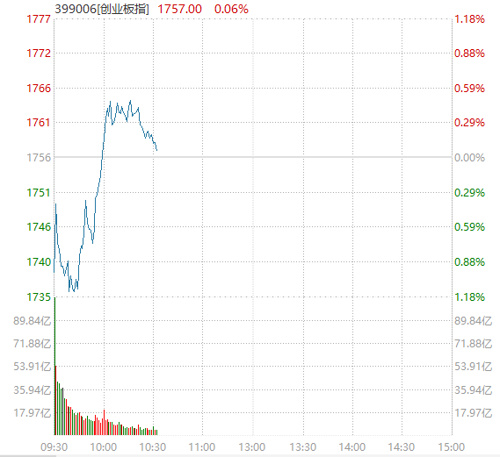 A股早间小幅低开:上证指数跌幅为0.2%,报3059.06点;深证成指跌幅为0.55%,报9228.18点;创业板指跌幅为0.97%,报1739.01点。上午市场震荡回暖,创业板指从跌超1%拉升翻红。截至发稿,主要指数全线飘红。