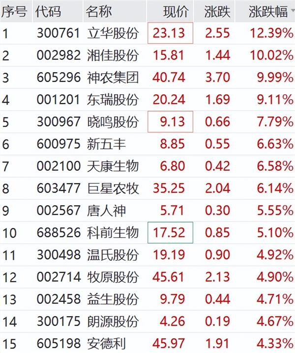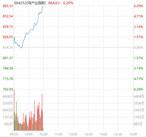 农业板块盘中发力,鸡产业直线冲高,涨超6%。湘佳股份、神农集团涨停,立华股份、东瑞股份、晓鸣股份等多股跟涨。