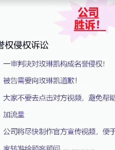 从网络晒出的玫琳凯方面对此事的态度来看,认为公司胜诉,一审判决被告形成了对公司的诽谤和造谣,对玫琳凯构成名誉侵权,被告需要向玫琳凯道歉!公司将尽快制作官方宣传视频,便于大家转发给顾客顾问。还提醒大家不要去点击被告方发布的视频,避免帮助其增加流量。