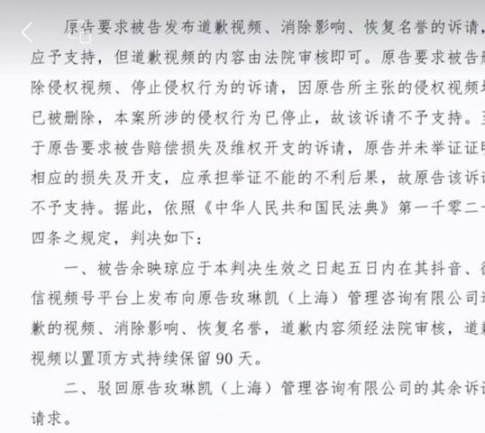 原告要求被告发布道歉视频、消除影响、恢复名誉的诉请应予支持。被告应于本判决生效之日起五日内在其抖音、微信视频号平台上发布向原告玫琳凯(上海)管理咨询有限公司道歉的视频,消除影响、恢复名誉,道歉内容须经法院审核,道歉视频以置顶方式持续保留 90天。