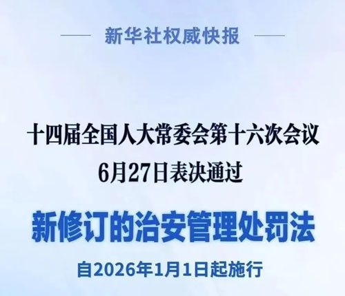 6月27日,中华人民共和国主席令第四十九号,《治安管理处罚法》修订通过,2026年1月1日起施行。
