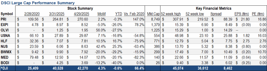 直销企业股指(DSCI)五月相比四月份增长了4.3%,略高于道琼斯指数(DJIA)4.1%的月度增幅。在2025年的前五个月里,直销企业股指有小幅增长,涨幅为0.086%。