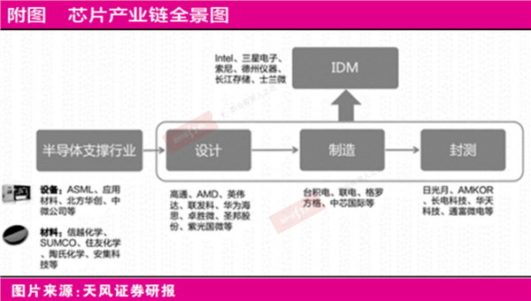 华通表示,芯片产业链又可以分为五个关键环节,芯片设计(fabless,包括韦尔股份、卓胜微、兆易创新等)、芯片制造(foundry,包括中芯国际、华虹半导体等)、芯片设计制造一体化(IDM,包括华润微、士兰微等)、芯片上游材料(包括沪硅产业、立昂微等),芯片下游封测(包括长电科技等)。