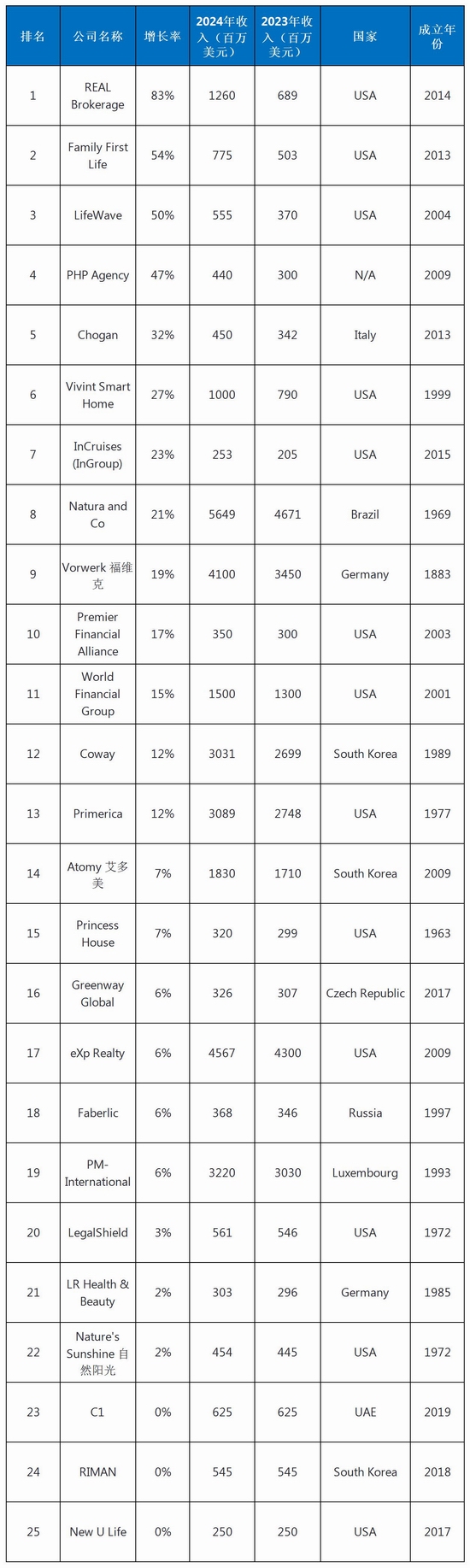 Epixel发布按增长率排列的100强直销企业。前25名单中福维克、艾多美、自然阳光上榜。