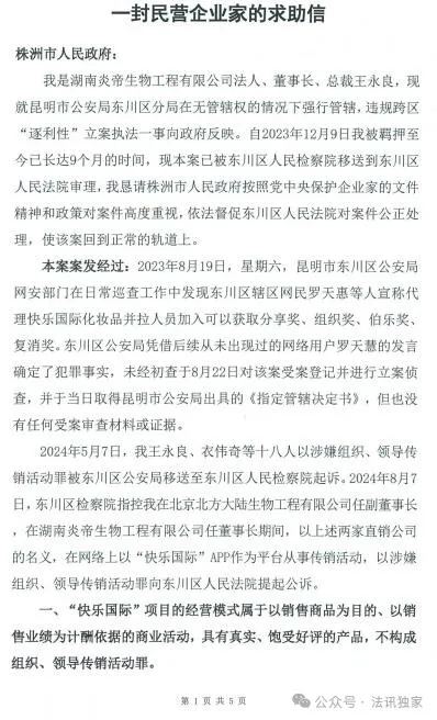 2024年5月7日,我王永良、衣伟奇等十八人以涉嫌组织、领导传销活动罪被东川区公安局移送至东川区人民检察院起诉。2024年8月7日,东川区检察院指控我在北京北方大陆生物工程有限公司任副董事长,在湖南炎帝生物工程有限公司任董事长期间,以上述两家直销公司的名义,在网络上以“快乐国际”APP作为平台从事传销活动,以涉嫌组织、领导传销活动罪向东川区人民法院提起公诉。