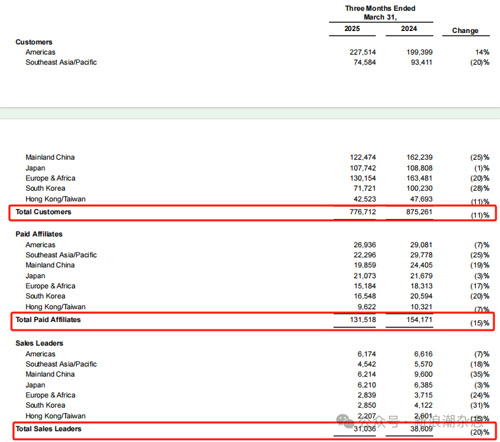 中国市场的表现尤为引人深思。财报显示,中国区营收4777万美元,同比下降21.8%,在总营收中的占比从去年的14.6%降至13.1%。具体来看,客户数量下降25%,从16.2万降至12.2万;付费经销商减少19%,从2.4万降至1.9万;销售领袖缩减更为明显,降幅达35%,从9600人降至6214人。