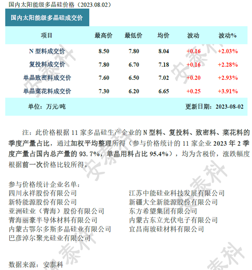 证券之星光伏行业周报:中国有色金属工业协会硅业分会数据显示,本周多晶硅订单成交数量增加,价格延续微涨走势。民生证券最新观点指出,HJT具有转换效率高、衰减率低等优势,且能和钙钛矿叠层达到更高的转换效率,有望成为未来光伏电池技术的主流方向。今年以来产业内加快对HJT降本增效的探索,近期行业迎来频频突破,HJT的产业化进程或将加速。宏观方面,国家发展改革委、财政部、国家能源局联合发布《关于做好可再生能源绿色电力证书全覆盖工作促进可再生能源电力消费的通知》,企业方面,TCL中环募资138亿元投建35GW硅片、25GW N型TOPCon电池,协鑫集成将原募资金额下调为48.57亿元。